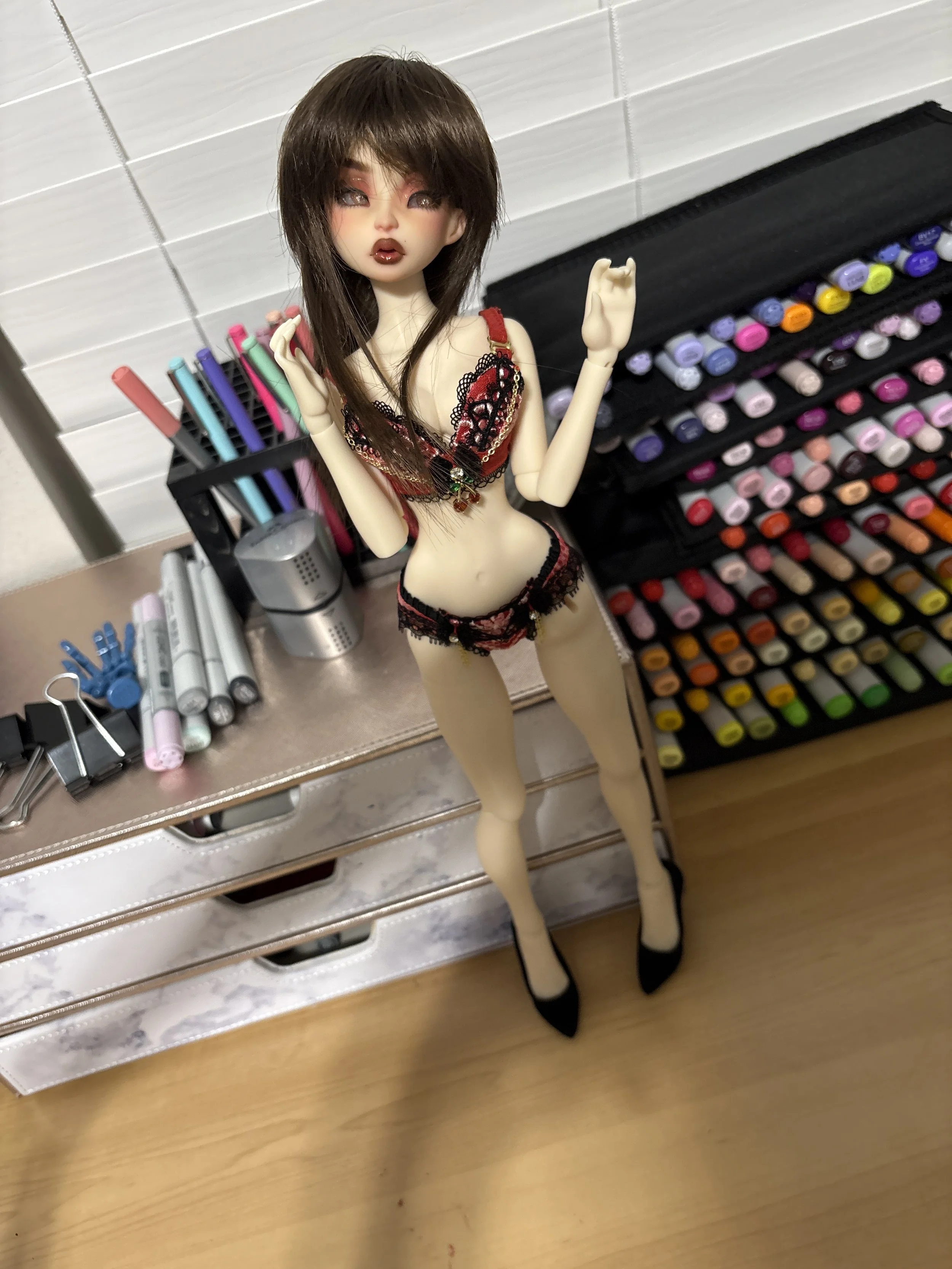 I bought this gorgeous lingerie set at I-Doll Osaka from Mint Star but hadn’t had the chance to use it yet. The red and black combo fit so well with my Rivanone’s faceup, so she totally had to use it.